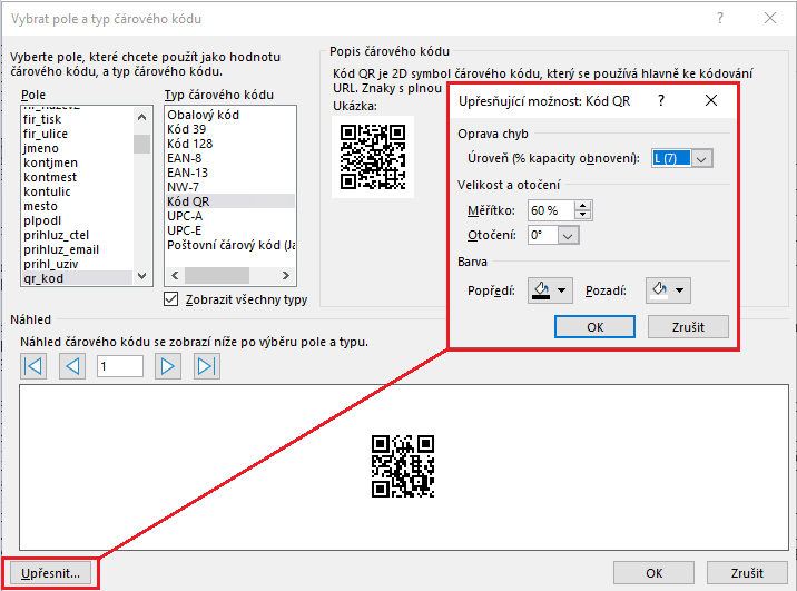 • Pokud vyberete více polí QR_kod, tak se musí nadefinovat každý samostatně